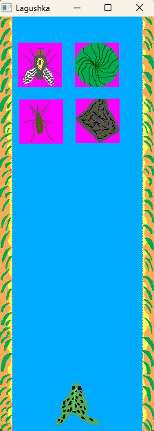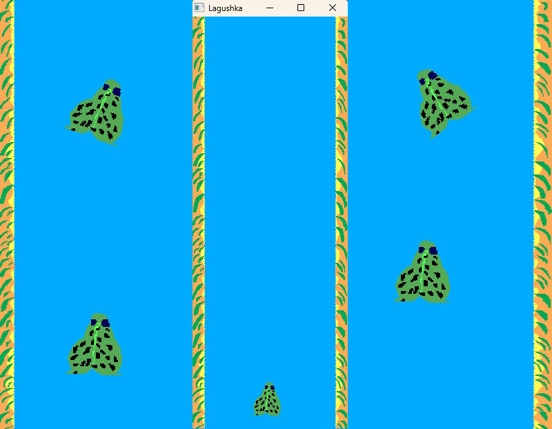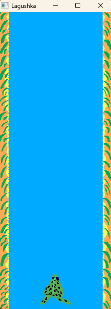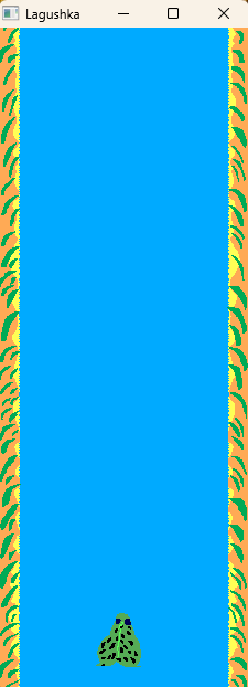 Little screen here is vertical. And start resolution – 800 x 600. But, I make it smaller about horizontal. And frog. Lagushka. Sprite is from a bmp file. Colorful. Everything is so colorful and beautiful. Sprites are for this purpose. I dream to learn how to do such bright things. As a beautiful graphics for arcades. Or consoles like MegaDrive or Nes. MS DOS VGA graphics, also, is very beautiful.