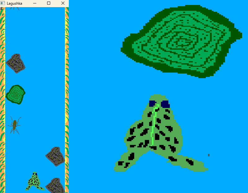 And, I forget, that frog has a long tongue. So, you try it with pressing space button. 3 animation frames. Such orange tongue. As idea you can to shoo flies and mosquitos. But, now, it has no implementation. Simply, with the space it works tongue animation.