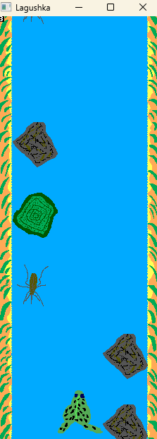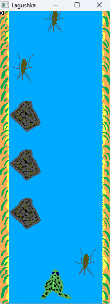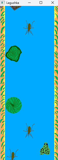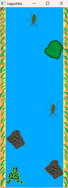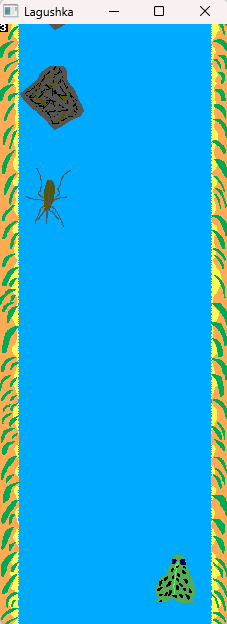 So, saying simple, there are types of objects here. These are simple decorations. As little island or water lilies. And obstacles as little stones and flies and mosquitos. So, with these things you will to swim! So as idea, it is good and kind and funny arcade. Simple game with graphics and sprites.