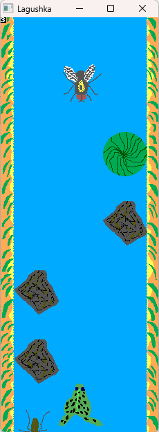 Frog has move along x axis. Something like three positions. Left, center, right. Arrows left and right. And space – this is tongue. Using it you shoo flies, for example.