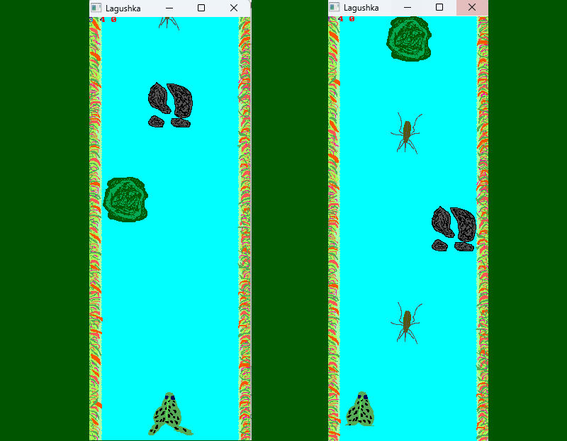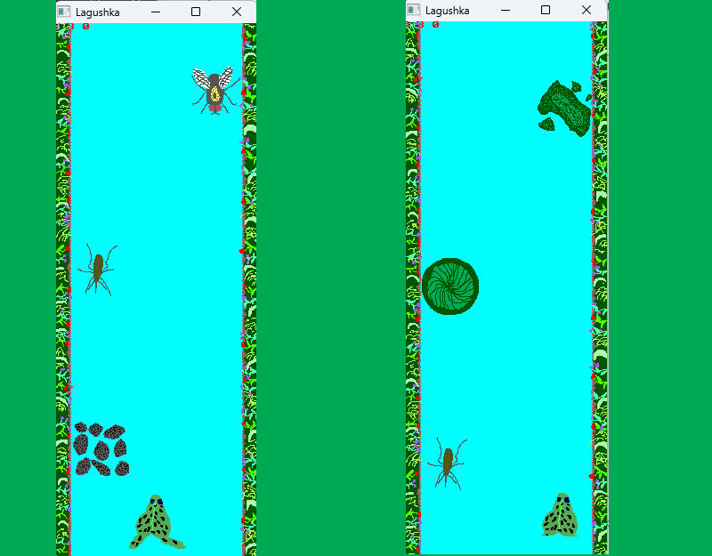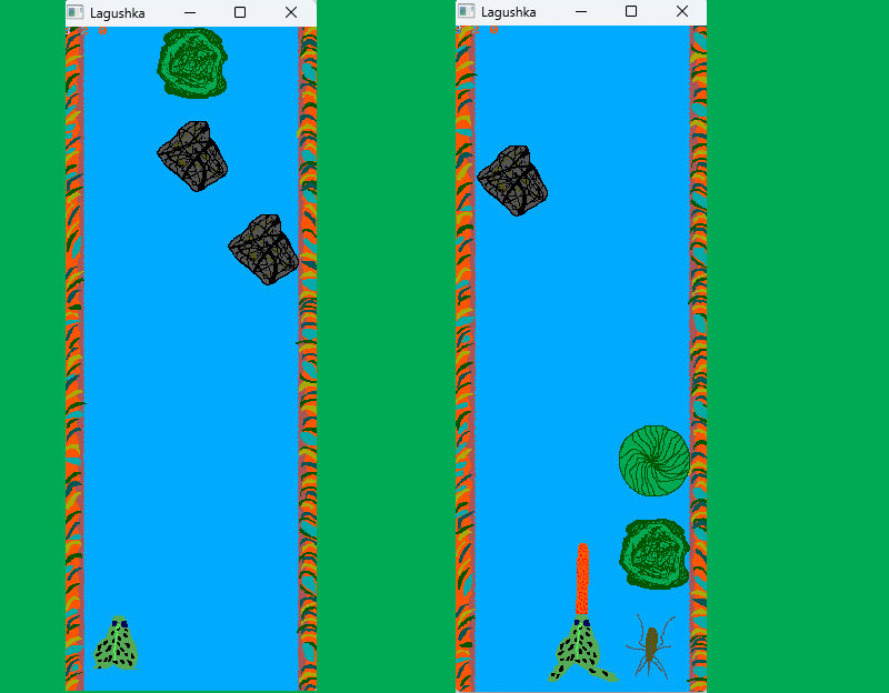 It will be more objects at the screen. And, so, as idea every sprite fills screen. But, the way, to frog have a time to react. There is some free space. Without stones and flies and mosquitos. And, mainly, it is everything bright. Stones, water lilies, flies and mosquitos. All the screen is full with game objects! Game is not difficult! That’s why, you really can see all of these!