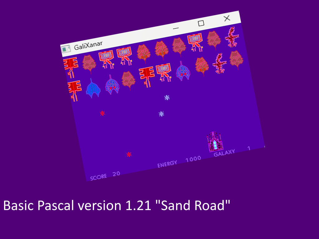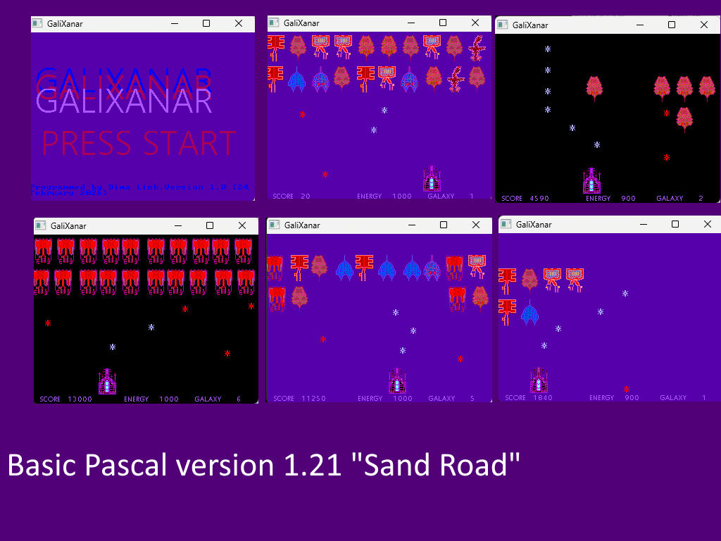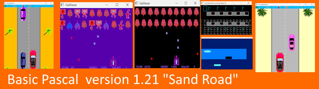 Basic Pascal version 1.21 "Sand Road" – most newest version. In this version there are 4 new games! Straight Road, Galixanar, Crest and Shooting Mod X, Fish Arcade Extreme Mod. And even more retro games! It is a pack of retro games with modern versions of Basic and Pascal.