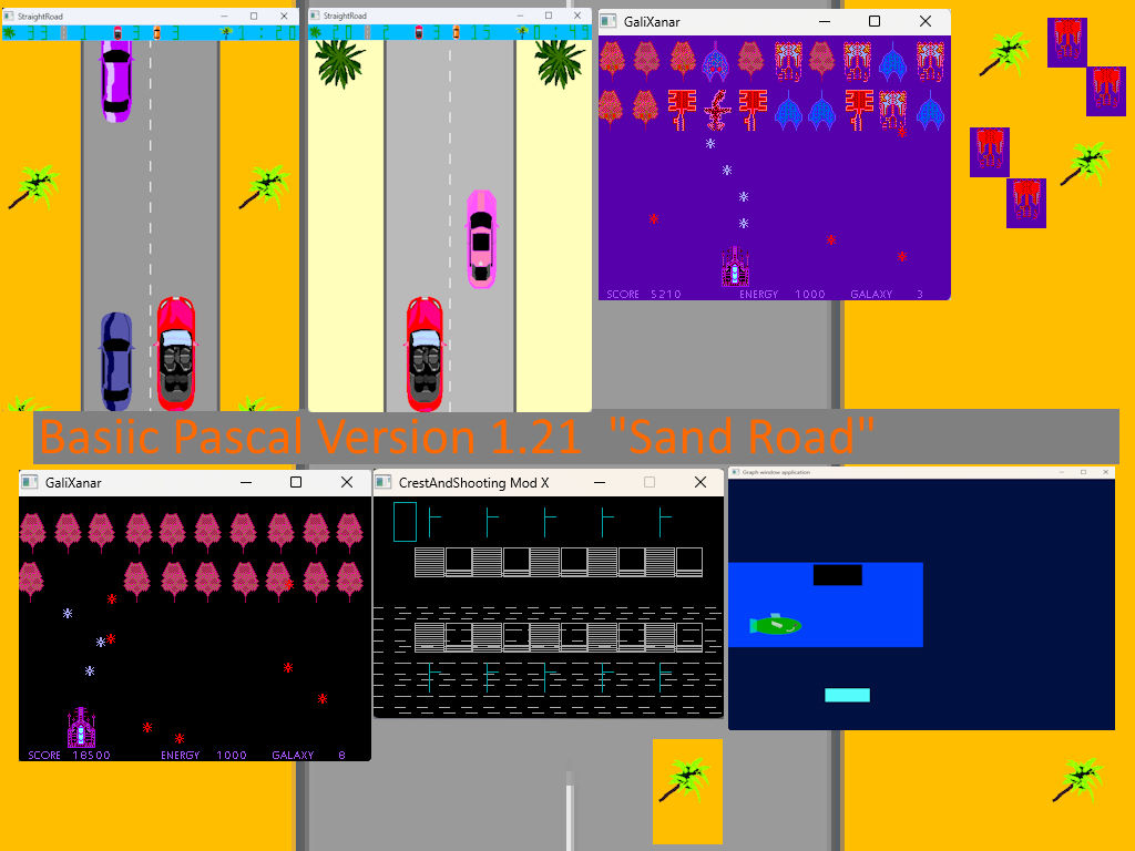 Basic Pascal version 1.21 "Sand Road" – most newest version. In this version there are 4 new games! Straight Road, Galixanar, Crest and Shooting Mod X, Fish Arcade Extreme Mod. And even more retro games! It is a pack of retro games with modern versions of Basic and Pascal.